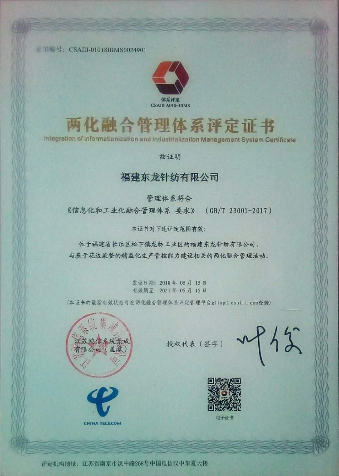 工信部?jī)苫诤瞎芾眢w系評(píng)定證書(shū)/2018-09-04